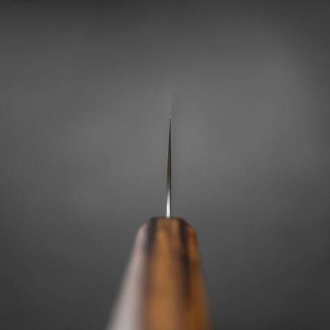 “Kiritsuke” knifes are an all-purpose knife featured a diagonally cut-off tip. Kiritsuke knives are one of the few multipurpose traditional Japanese blades, and can be used as a slicer or a vegetable knife. These sword shaped knives feature a straighter and wider edge than a yanagi for vegetables, and a longer blade than an usuba for slicing fish with ease. The user needs more skill with traditional Japanese knives in order to utilize this unique kiritsuke style design properly. Traditionally, these knives are used only by the chefs as a symbol of status.