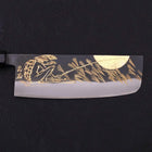 Aogami No.2 (Hitachi Metals Ltd.) is made by adding Chromium and Tungsten / Wolfram to Shirogami No.2. This results in increased toughness and the production of hard carbide molecules which improve edge retention. Many knife users have noted that while Aogami No.2 is very similar to Shirogami No.2 in terms of edge sharpness, it has slightly superior edge retention.The traditional style of Japanese carving has a long history of simplicity and inspiration. Although this technique (Chokin) is gradually disappearing into history, we hope to do our best to let more people feel its beauty.This is a limited edition of our kitchen knives in collaboration with the carver Asamura Takao, whose over 50 years of carving skills make each piece look so spiritual. Each design has been polished for months, even a year or more.