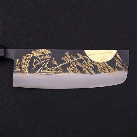 Este Nakiri de acero al carbono de tipo Azul #2 con acabado Kurouchi y grabado en oro de un kappa pescador es la herramienta de cocina perfecta para ayudar a pulir sus habilidades en la preparación de sushi. Esta pieza de excelente filo asegurará cortes limpios y precisos, y el mango de ébano y cuerno de búfalo proporciona un agarre confortable y seguro. Alcance la excelencia en sus preparaciones con este cuchillo japonés fuera de serie.