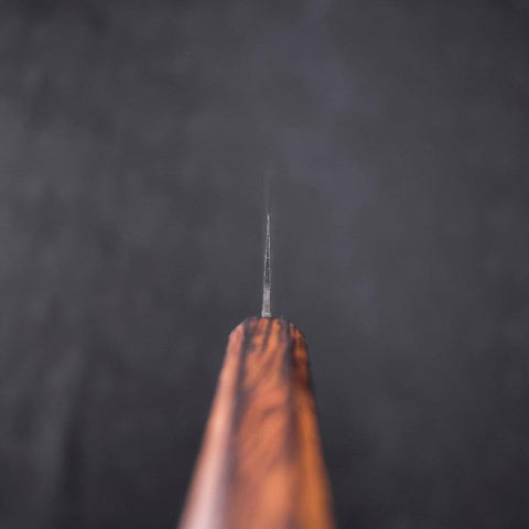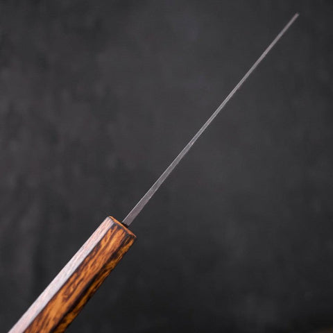 Shirogami No.2 has minimal impurities and a very fine grain structure, so it is ideal for fine cutting tools such as Japanese traditional-style knives. Despite being a ‘simple’ carbon steel, Shirogami No.2 has very good edge retention and it is also very easy to re-sharpen. Recommended for first-time users of Japanese traditional-style knives.Kurouchi Finish, the unprocessed (black) part on the top side of the blade has already developed a dark patina, which protects the blade and gives it a traditional Japanese look.