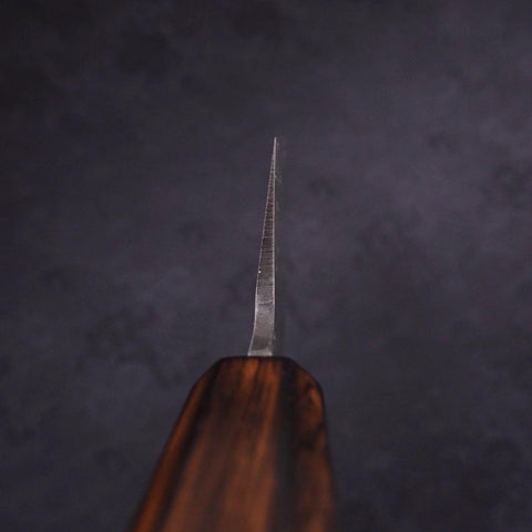 Aogami No.2 (Hitachi Metals Ltd.) is made by adding Chromium and Tungsten / Wolfram to Shirogami No.2. This results in increased toughness and the production of hard carbide molecules which improve edge retention. Many knife users have noted that while Aogami No.2 is very similar to Shirogami No.2 in terms of edge sharpness, it has slightly superior edge retention.Traditional Kasumi polished finish. Kasumi roughly translated to “mist” or “cloud” and refers to the hazy appearance of the soft steel/iron cladding, in contrast to the fine polished cutting edge. This elegant finish is very common on traditional style Japanese blades.